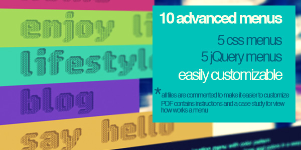 Super menu pack is a collection of 10 cool menus, 5 in pure css and 5 using jQuery framework for customize or layout with your websites or applications and projects.It’s perfect for anyone who wants to give a special touch to their designs or find a starting point. Collection is as varied as possible in style and appearance to give you choice. Thinking in design working with code.
