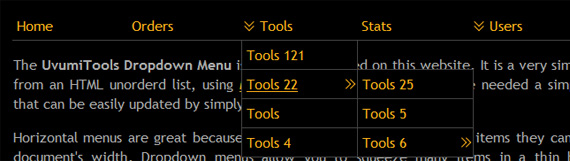 The UvumiTools Dropdown Menu is the menu featured on this website. It is a very simple multi-level menu built from an HTML unordered list, using Mootools Javascript Framework, it can be easily updated by simply editing a <ul> HTML element.