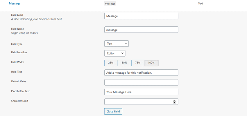 - Message – A Text field that will display our custom message. This field will be housed in the main Editor area of Gutenberg.